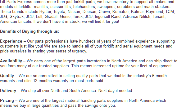 We have first-rate prices on all our lift truck parts. For a price quote on an attachment or part we offer, please contact us at: